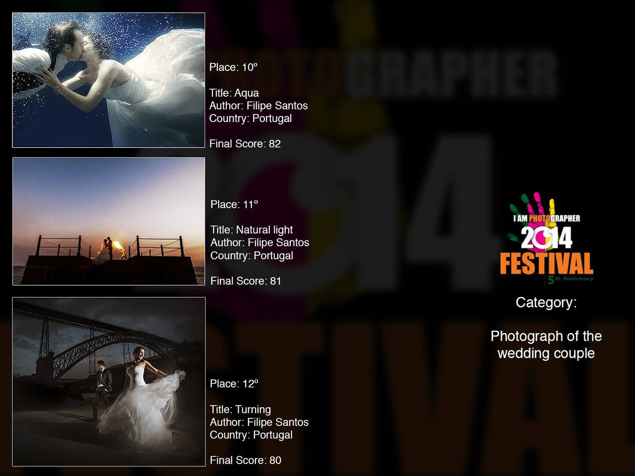 - 2º lugar no festival internacional “I AM PHOTOGRAPHER 2014 FESTIVAL”, na categoria “Photo of the Bride or the Groom”.