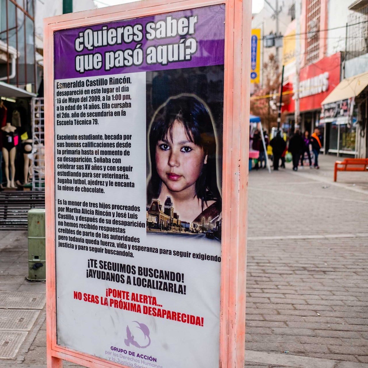 Durante este sexenio, al menos 76 niñas han desaparecido en Chihuahua. Esmeralda, de 14 años, es una de ellas. Desapareció el 19 de mayo de 2009 cuando se dirigía a la secundaria. Gracias a la ayuda de otras personas y del dinero recabado en una vendimia de hamburguesas, sus padres viajaron al Distrito Federal para que la fotografía de su hija “aparezca en todos lados”. A su pesar por la ausencia de su hija se adhiere una profunda desconfianza hacia el gobierno mexicano, que no cuenta siquiera con líneas de investigación
