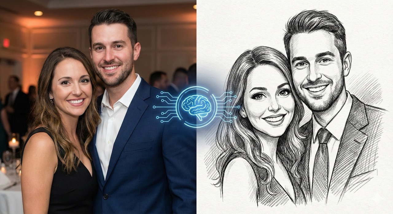 Um photobooth diferente de tudo o que já viu: caricaturas artísticas a grafite, geradas por inteligência artificial e impressas na hora. Cada convidado leva para casa uma obra de arte original.