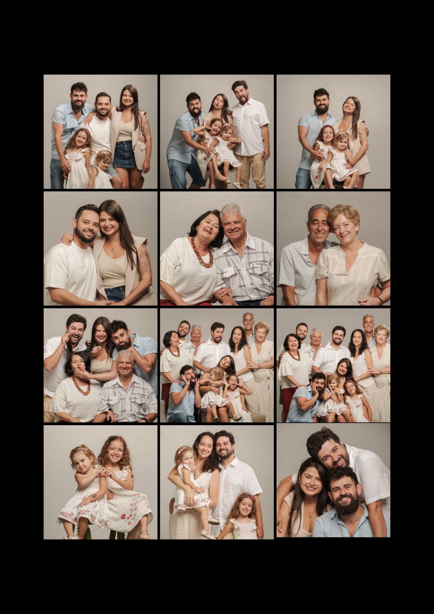 Retratos de Natal em família, com fundo preto ou branco, roupas e acessórios natalícios, pensados para criar uma memória especial desta época.
